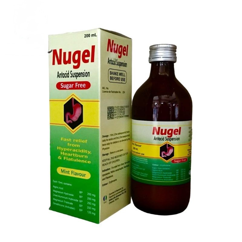 Nugel Suspension is an antacid for the symptomatic relief of gastritis, hyperacidity associated with peptic ulcer, reflux oesophagitis, dyspepsia, heartburn and flatulence. It contains the antacids Aluminium Hydroxide and Magnesium Hydroxide.